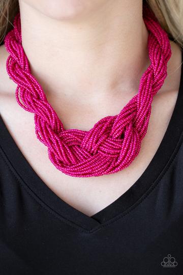 Countless strands of vivacious pink seed beads are twisted and knotted together to create an unforgettable statement piece. Features an adjustable clasp closure.