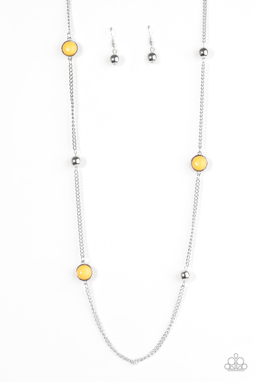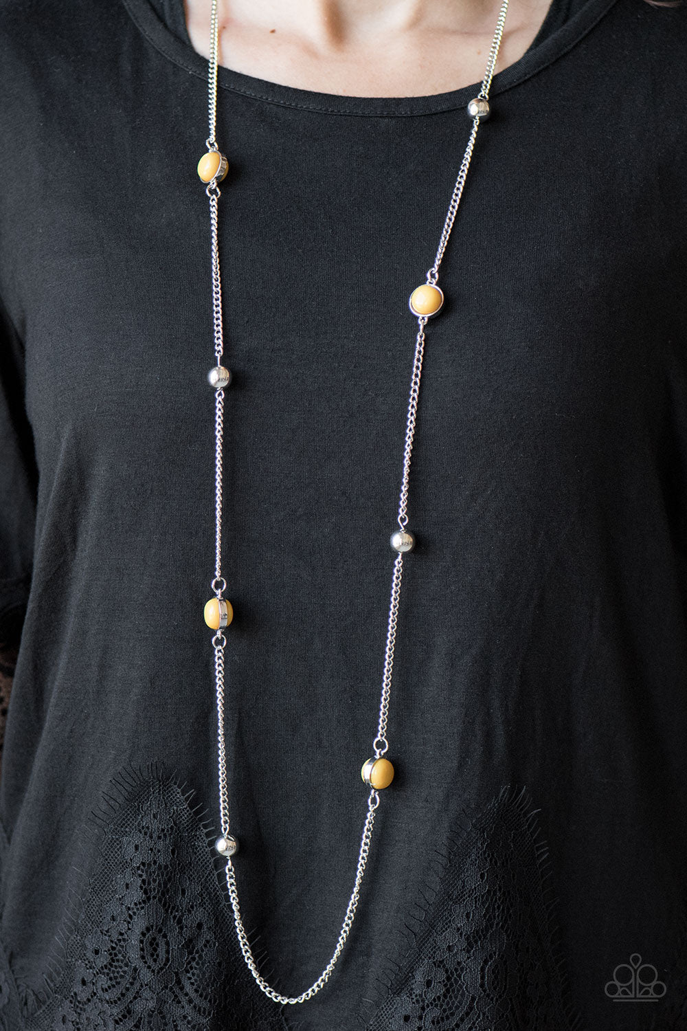 Earthy yellow beads are pressed into the centers of shimmery silver hoops, creating colorful accents along a silver chain. Shiny silver beads are sprinkled along the chain for a classic finish. Features an adjustable clasp closure.