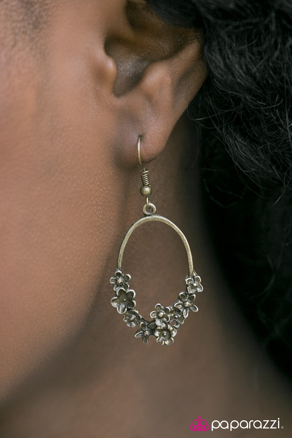 Brushed in an antiqued shimmer, dainty brass flowers join at the bottom of a dainty hoop for a whimsical look. Earring attaches to a standard fishhook fitting.
