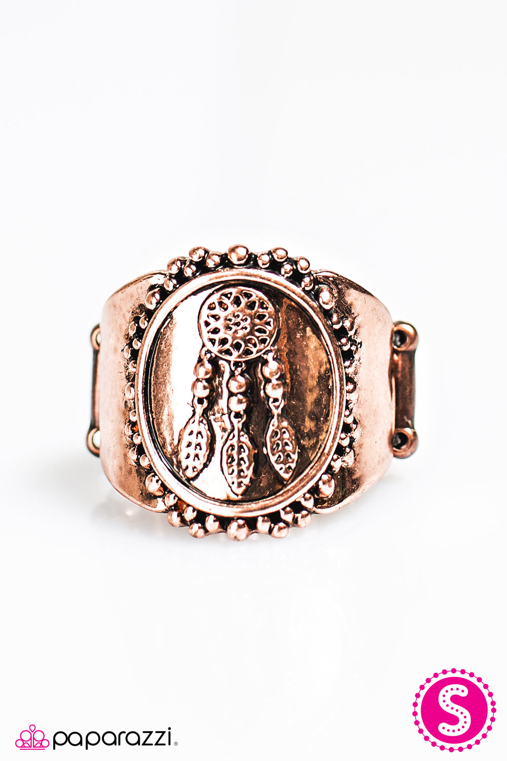 Embossed in a whimsical dreamcatcher pattern, a thick copper band wraps around the finger in an indigenous inspired design. Tiny copper studs add a rustic finish to the seasonal piece.