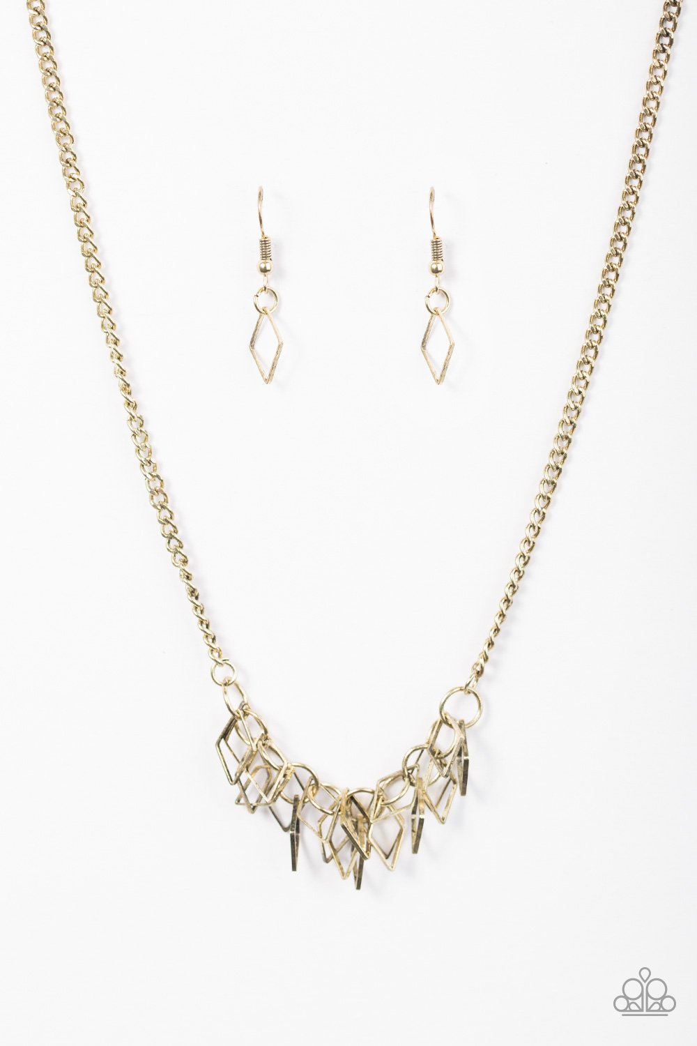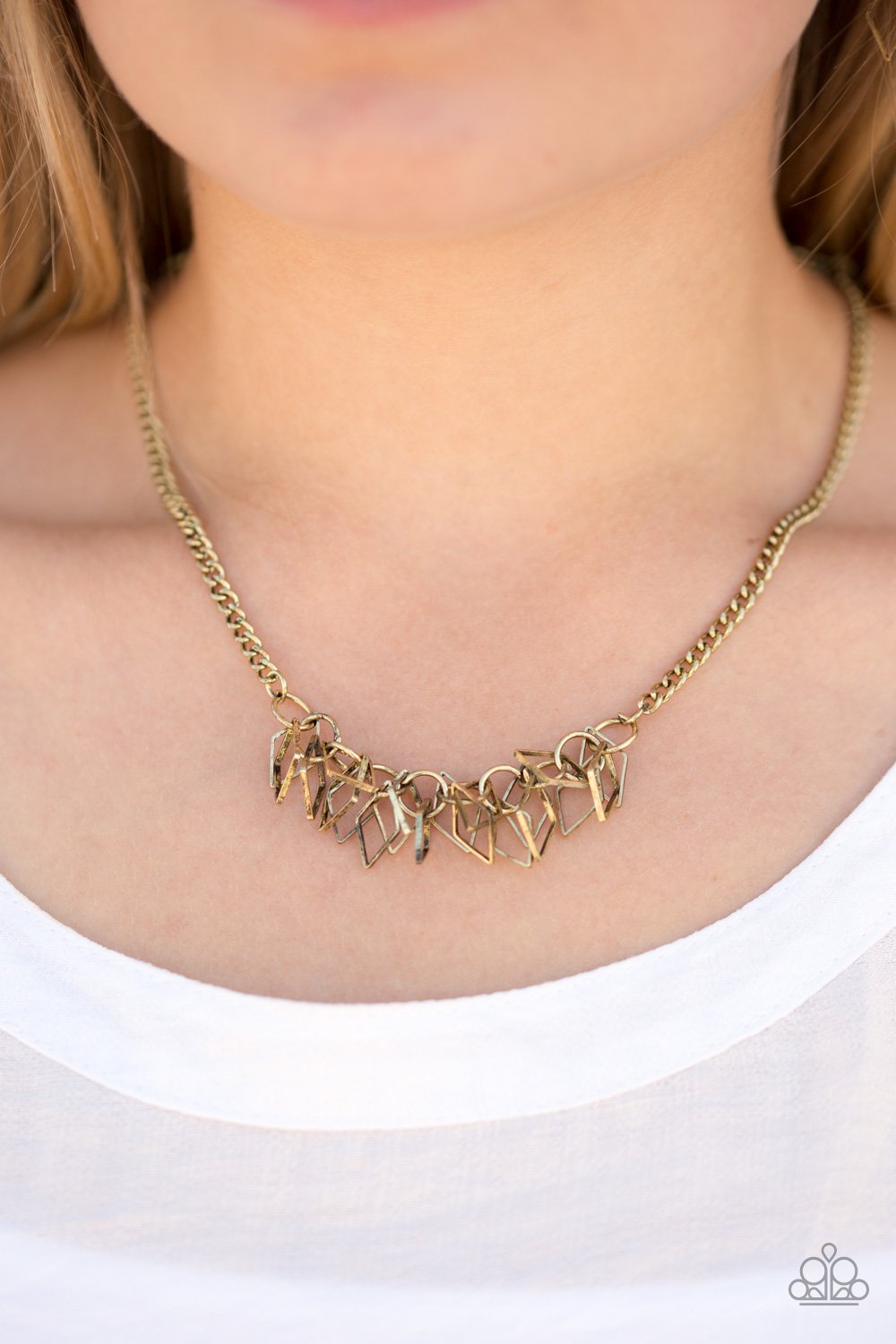 A thick brass chain gives way to a clustered fringe below the collar. Featuring a shiny brass finish, dainty diamond-shaped silhouettes swing from the bottom of the chain, creating a fierce fringe. Features an adjustable clasp closure.