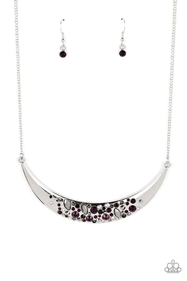 A stunning collection of round purple gems, smoky gems, dainty white rhinestones and marquise cut hematite shimmer across the surface of a shiny silver crescent. The bejeweled plate falls just below the collar in a dazzling finish. Features an adjustable clasp closure.