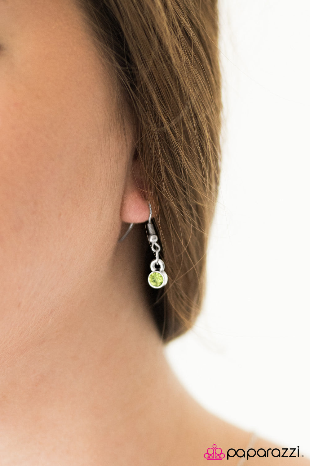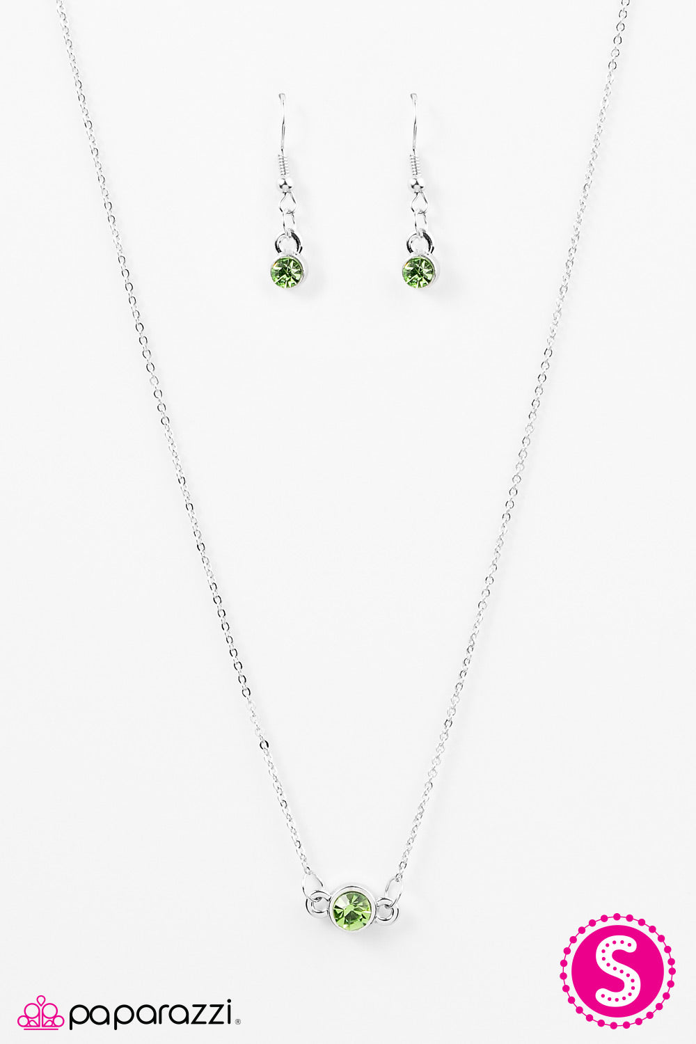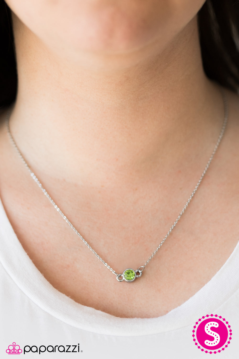 Encased in a dainty silver frame, a glittery green gem is suspended horizontally below the collar, creating a stationary pendant. Features an adjustable clasp closure.