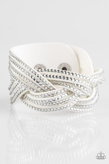 Glassy white rhinestones are encrusted along crisscrossing strands of white suede, creating bold shimmer around the wrist. Features an adjustable snap closure.
