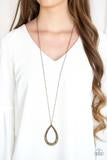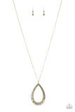 An oversized brass teardrop frame is encrusted in glittery aurum rhinestones that gradually increase in size at the bottom for a showstopping finish. The sparkling pendant swings from the bottom of a lengthened brass chain for a slimming finish. Features an adjustable clasp closure.