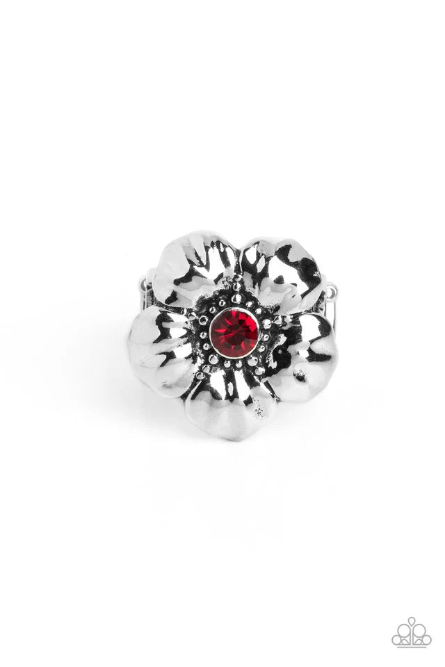 Dotted with dainty silver studs and a dainty Siam rhinestone center, folds of shiny silver curl into an oversized tropical flower for a whimsical dash of island inspiration atop the finger. Features a stretchy band for a flexible fit.