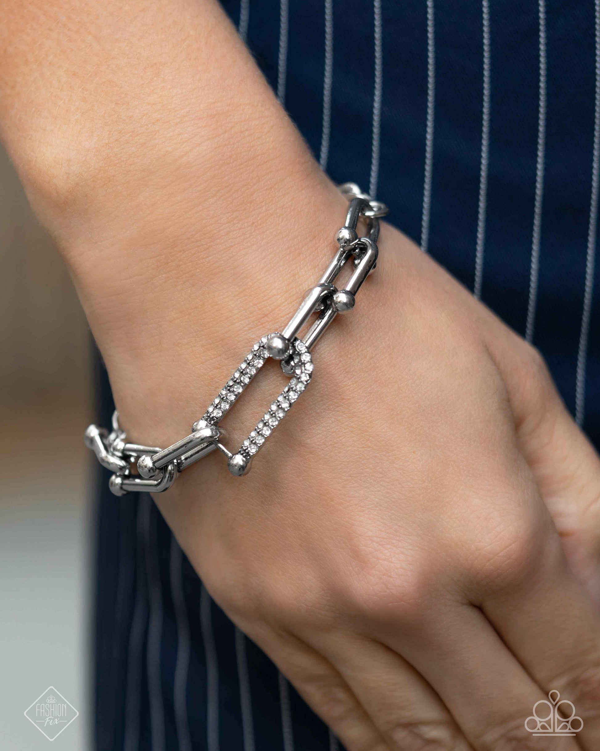 Gradually increasing in size, a shiny silver curb chain elongates into silver chain links looping around the wrist. One of the larger shiny silver links is embellished with glistening white rhinestones for an understated shimmery finish. Features an adjustable clasp closure.