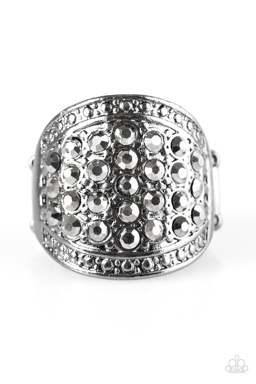 Glittery hematite rhinestones are encrusted along a delicately hammered gunmetal frame, creating dramatic shimmer across the finger. Features a stretchy band for a flexible fit.
