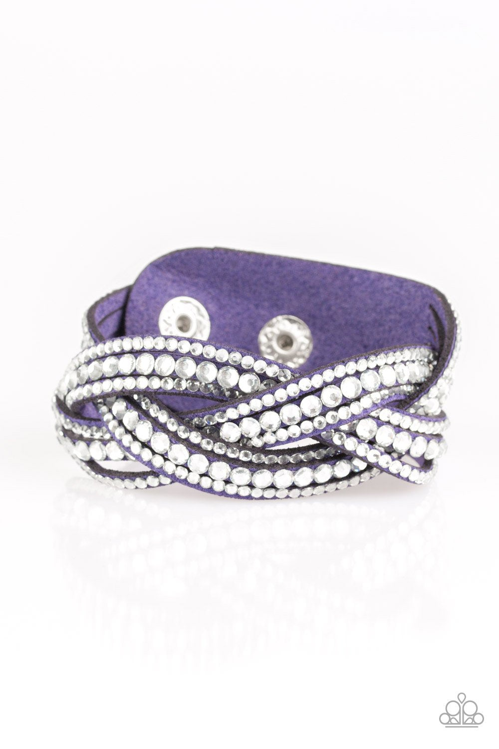 Varying in size, glassy white rhinestones are encrusted along interwoven blue suede bands, creating blinding shimmer across the wrist. Features an adjustable snap closure.
