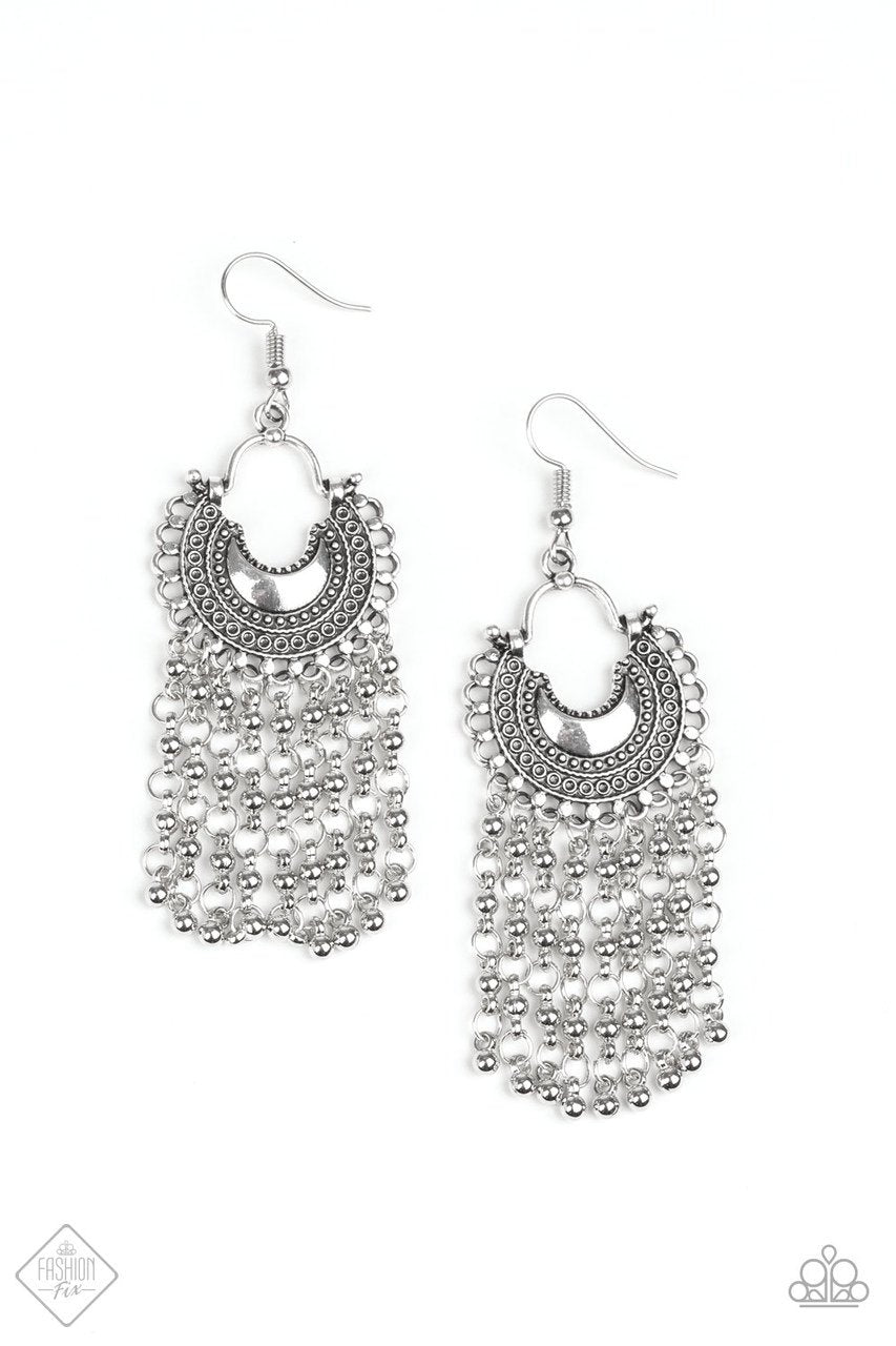 Beaded silver chains stream from the bottom of a textured half-moon silver frame, creating a dreamy fringe. Earring attaches to a standard fishhook fitting.
