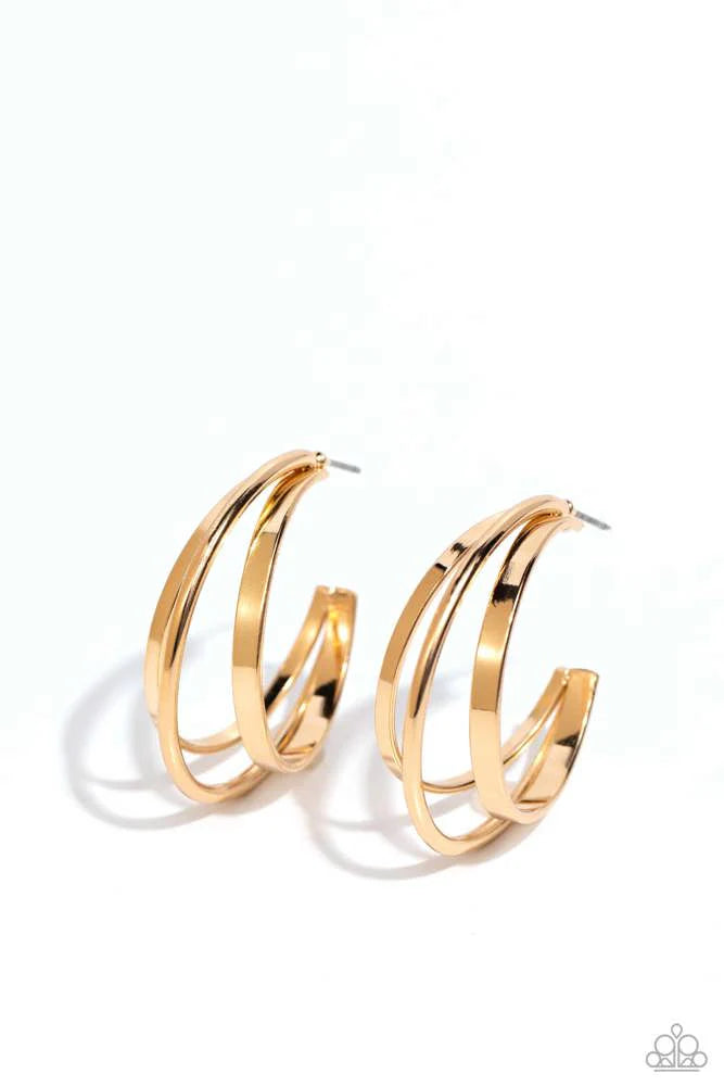 Featuring a high sheen, three thick curls of sleek gold join into an airy hoop for a beaming basic. Earring attaches to a standard post fitting. Hoop measures 1” in diameter. Sold as one pair of hoop earrings.