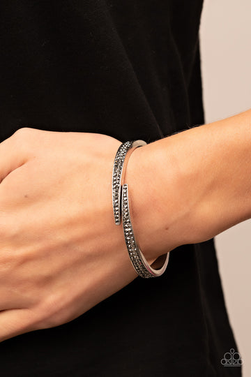 Encrusted in stacked sections of antiqued silver studs and smoky hematite rhinestones, two silver bars delicately overlap at the center of the wrist, resulting in an edgy cuff-like bangle. Features a hinged closure.