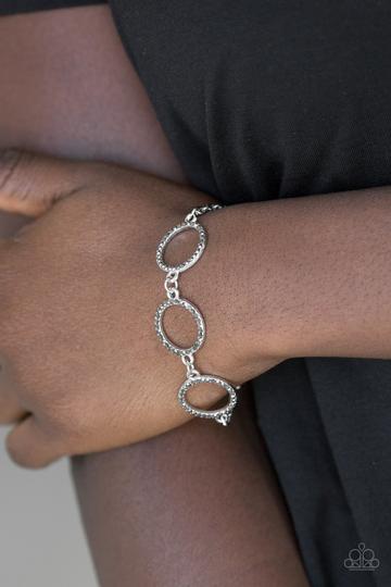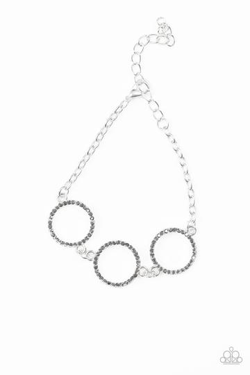 Encrusted in smoky hematite rhinestones, three glittery silver rings link across the wrist for a glamorous look. Features an adjustable clasp closure.