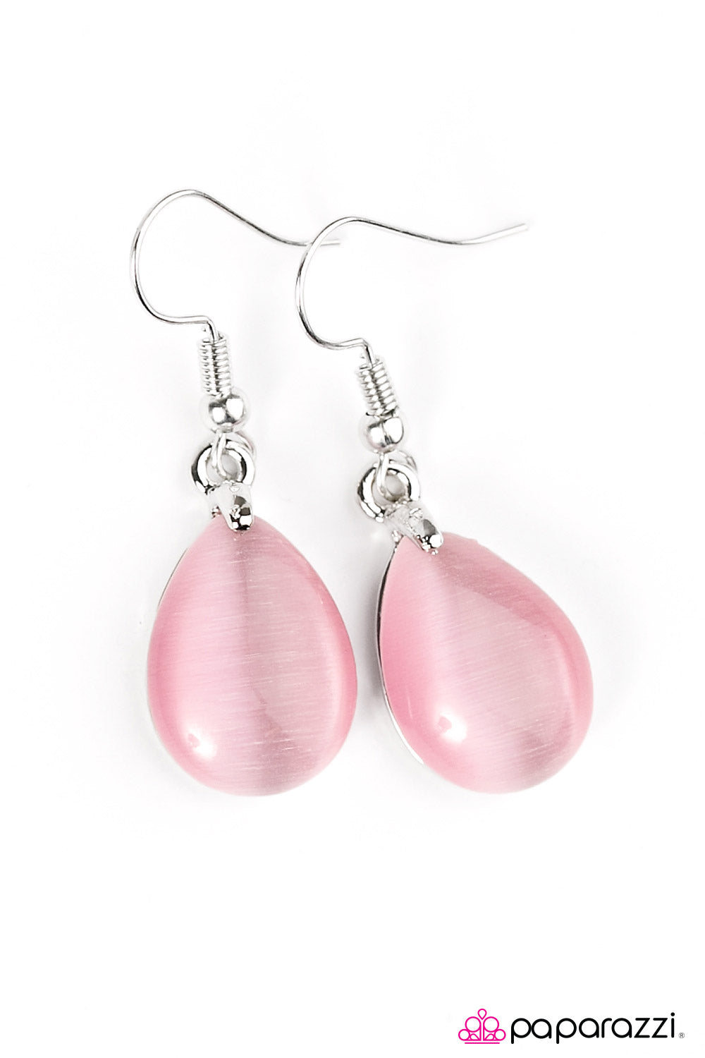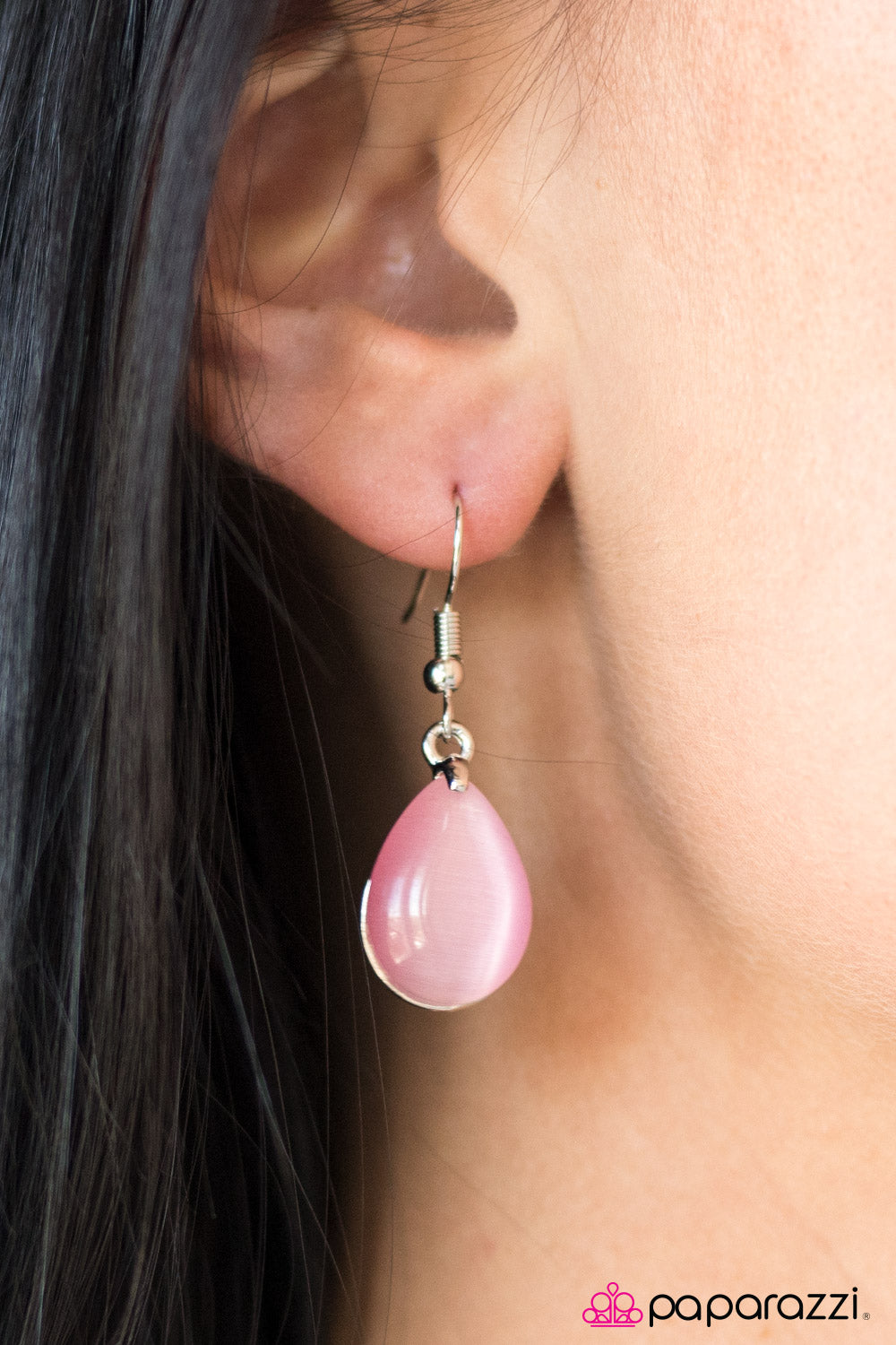 Chiseled into a smooth teardrop, a pink moonstone drips from the ear in a whimsical fashion. Earring attaches to a standard fishhook fitting.