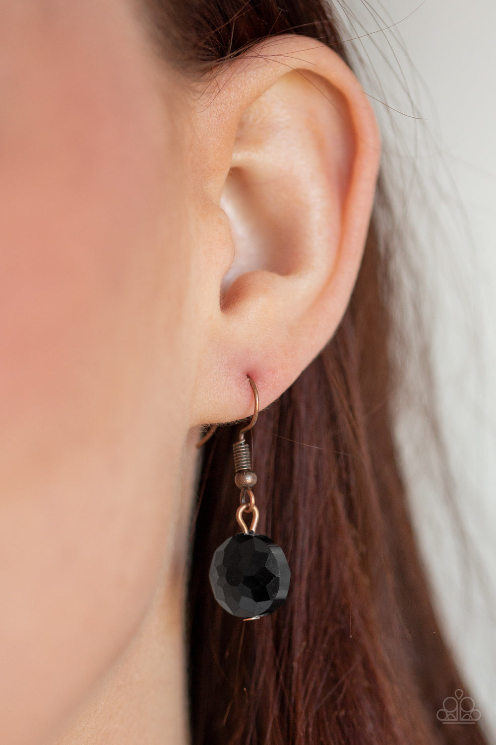 A collection of black rhinestone gems and abstract copper rings trickle along a classic copper chain across the chest for a refined flair. Features an adjustable clasp closure.