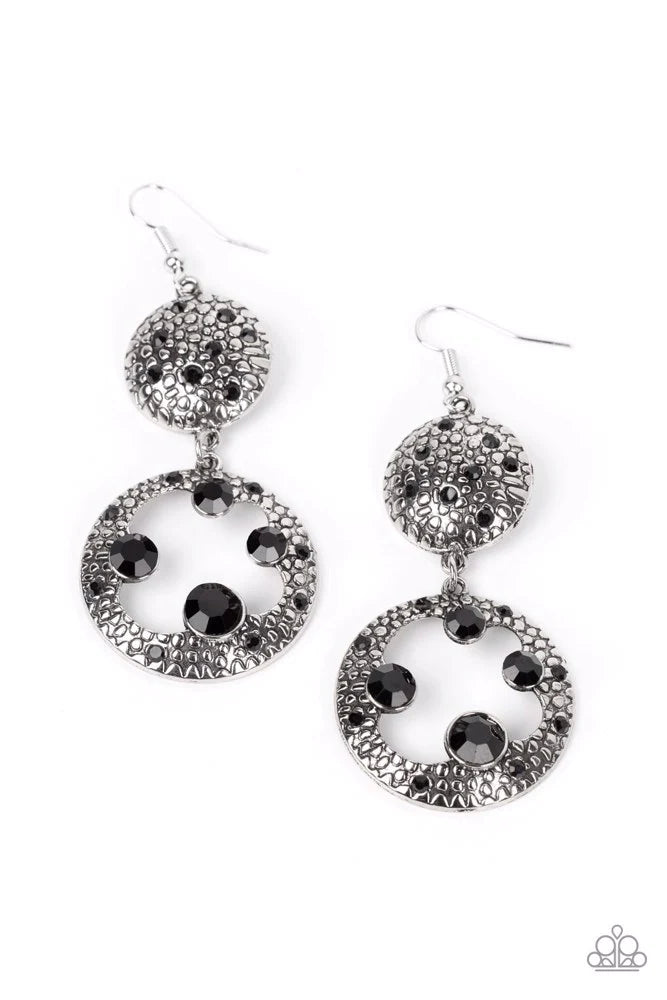Dotted with dainty black rhinestones and embossed in pebble-like textures, a beveled silver circle attaches to an imperfect silver hoop featuring matching texture. A smattering of oversized black rhinestones haphazardly adorns the hoop, resulting in a gritty shimmer. Earring attaches to a standard fishhook fitting.