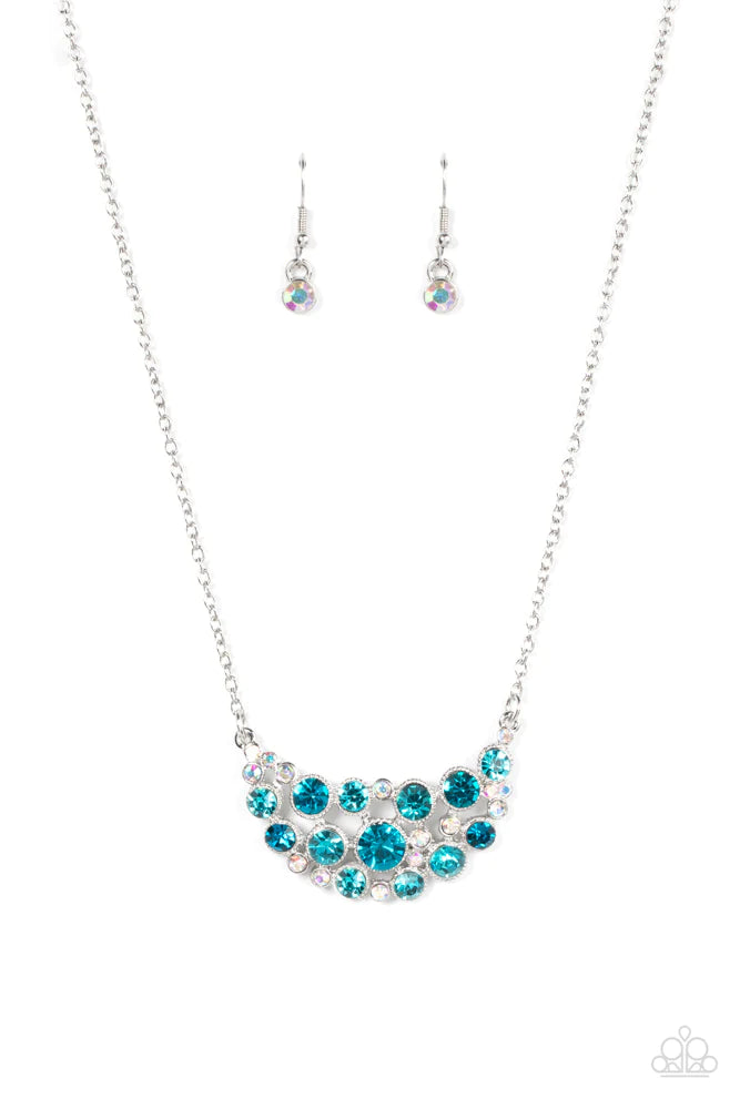 An effervescent collection of glittery blue and iridescent rhinestones delicately join into a bubbly half moon pendant at the bottom of a dainty silver chain, resulting in a sparkly statement piece below the collar. Features an adjustable clasp closure.