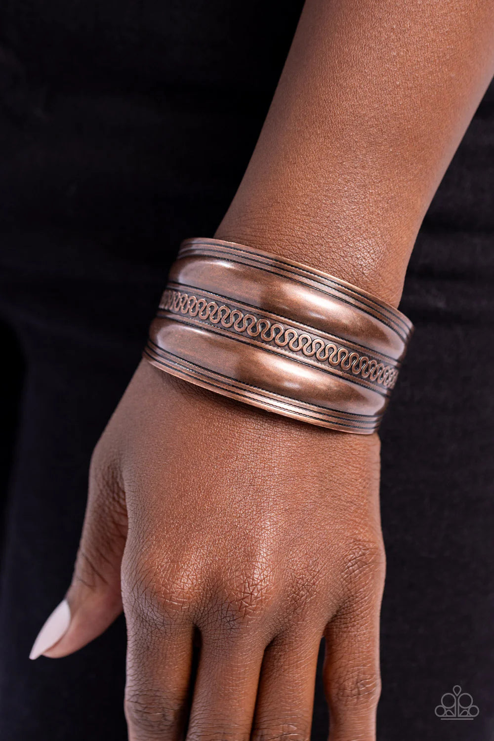 A rustic serpentine pattern is embossed across the center of a thick beveled copper cuff that is bordered in linear patterns, creating a bold metallic centerpiece around the wrist.