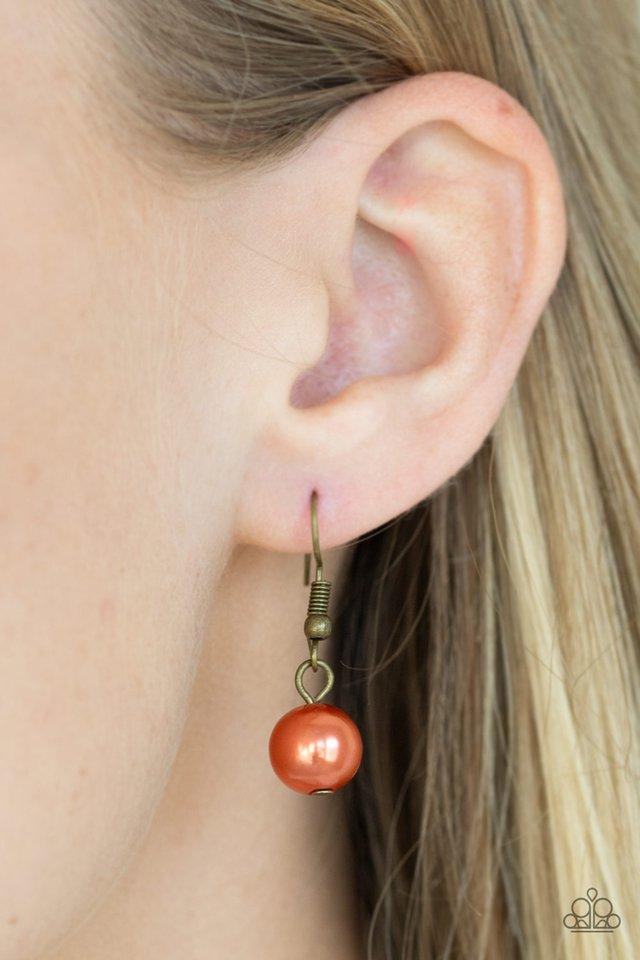 Featuring pearly and glassy finishes, an array of brass, brown, and orange beads swing from a double-linked brass chain, creating a fancy fringe below the collar. Features an adjustable clasp closure.