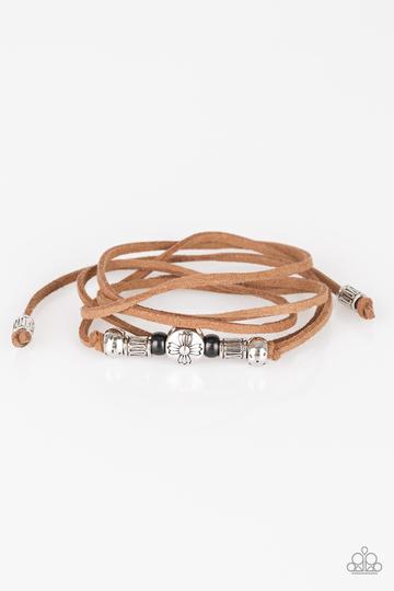 An array of black and silver beads are knotted in place along elongated suede cording for a wanderlust fashion. To secure bracelet, tie ends in place around the wrist at desired length.
