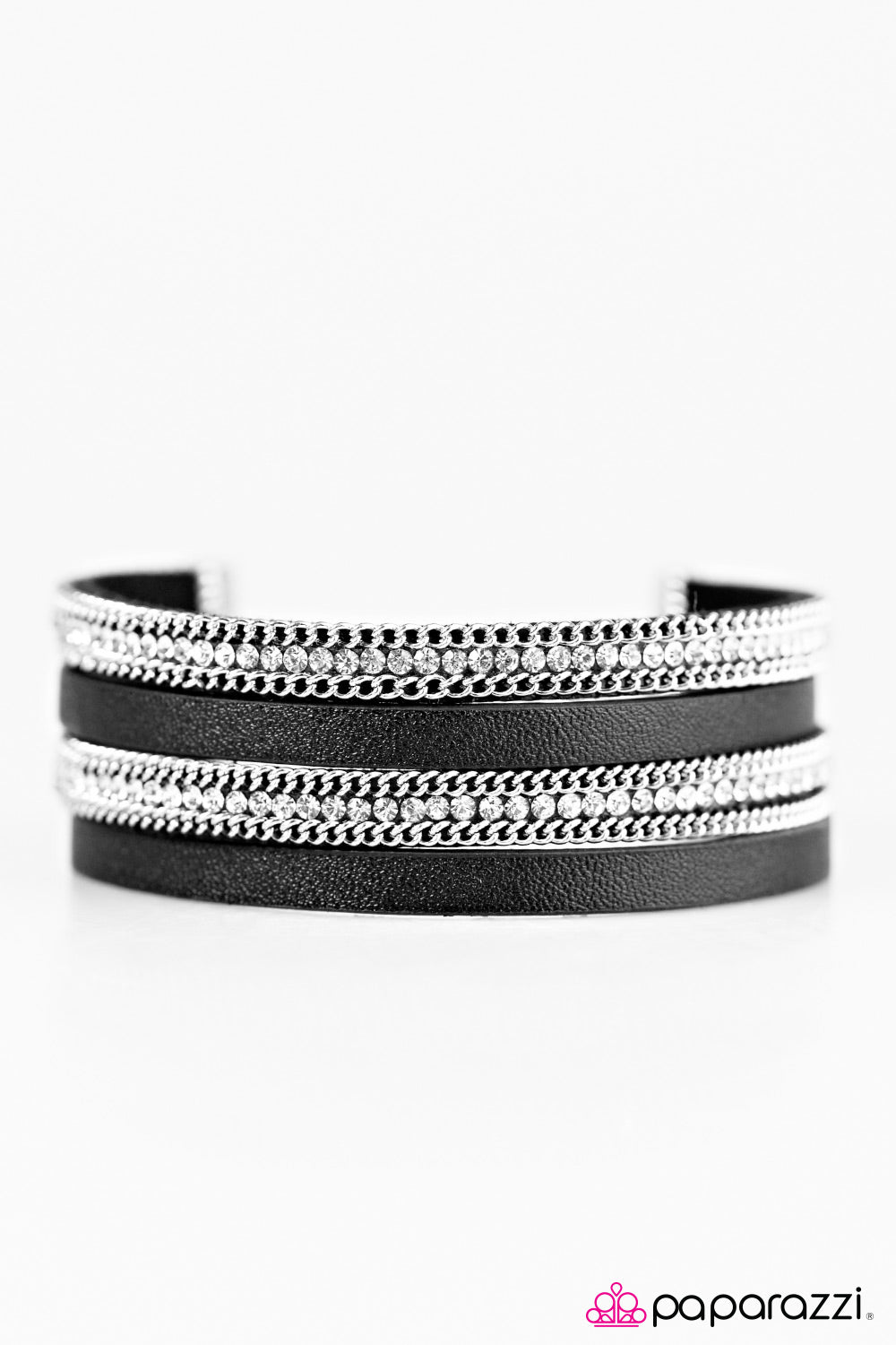 Connected to two silver accents, strands of black leather wrap around the wrist. Rows of silver chain and rhinestones alternate with the bold black strands, adding a flashy finish to the colorfully stacked palette. Features an adjustable clasp closure.