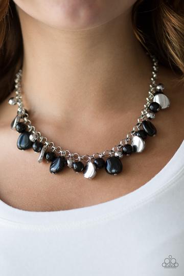 Featuring round and asymmetrical shapes, shiny silver and black beads swing from the bottom of a bold silver chain, creating a flirtatious fringe below the collar. Features an adjustable clasp closure.