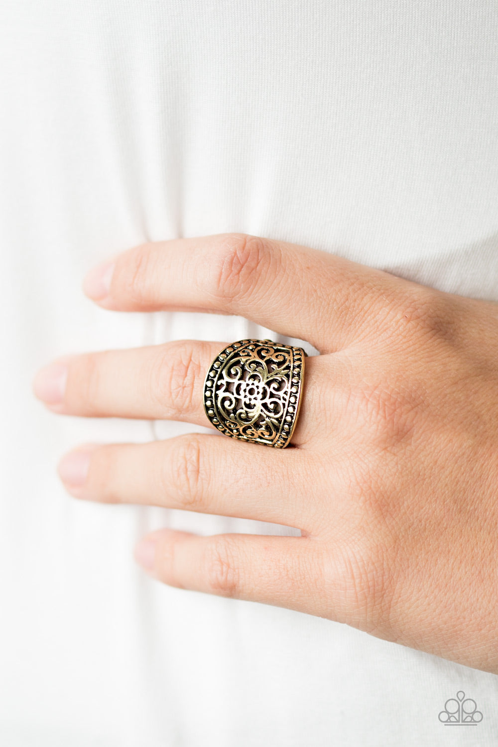Brushed in an antiqued finish, shimmery filigree climbs the finger, creating a whimsical floral band. Features a stretchy band for a flexible fit.