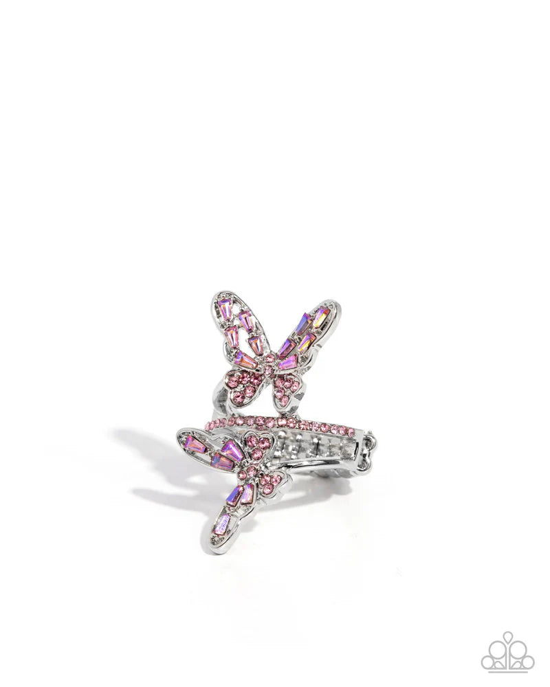 Two silver butterflies, encrusted with radiant pink rhinestones and sparkling UV baguette-cut accents, flutter across a layered band. The intricate detailing creates a whimsical and enchanting design, perfect for adding a pop of color and elegance to any look. Features a stretchy band for a flexible fit.
