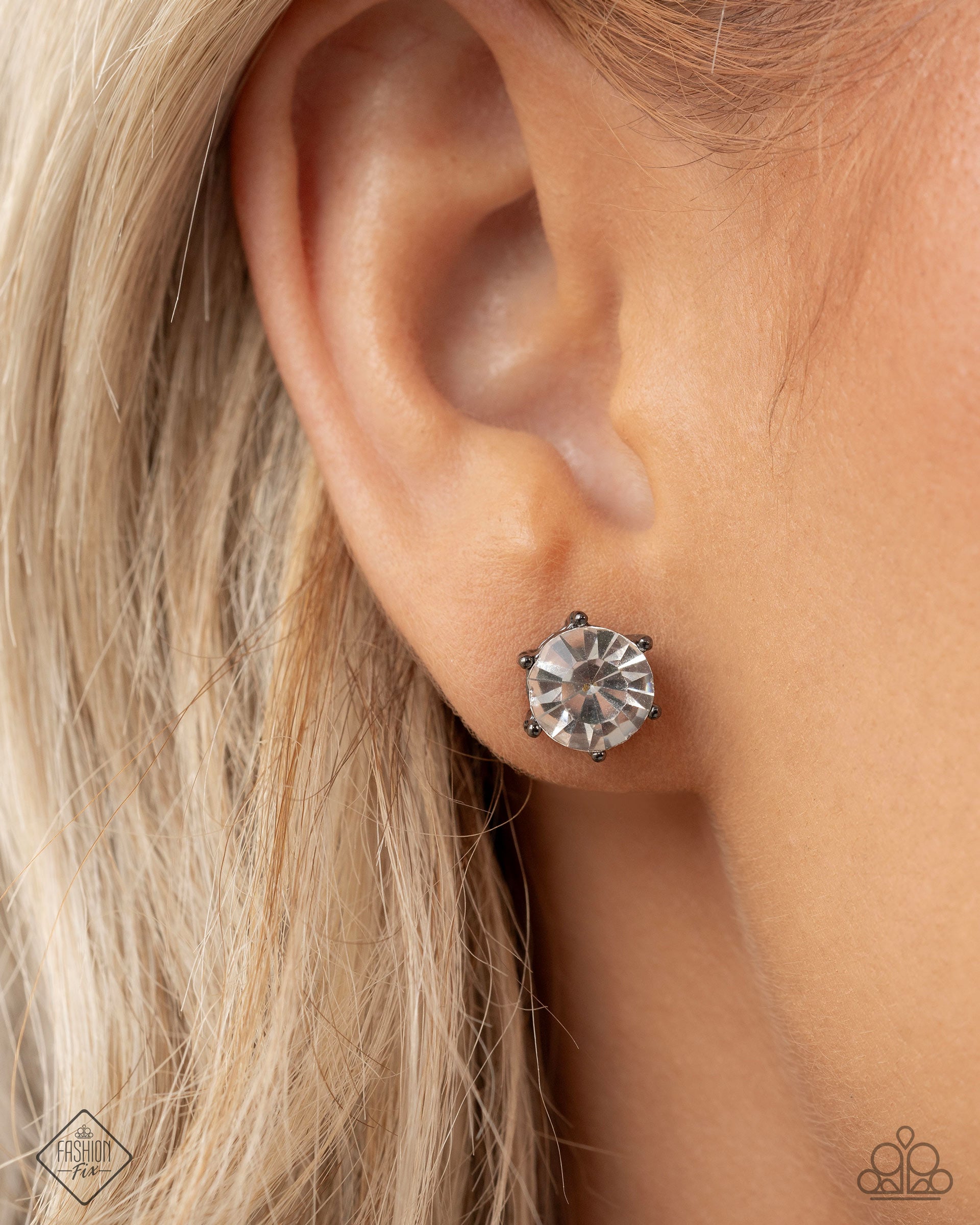A sparkling white rhinestone is nestled inside a classic gunmetal-pronged frame for a sassy shimmery look. Earring attaches to a standard post fitting.