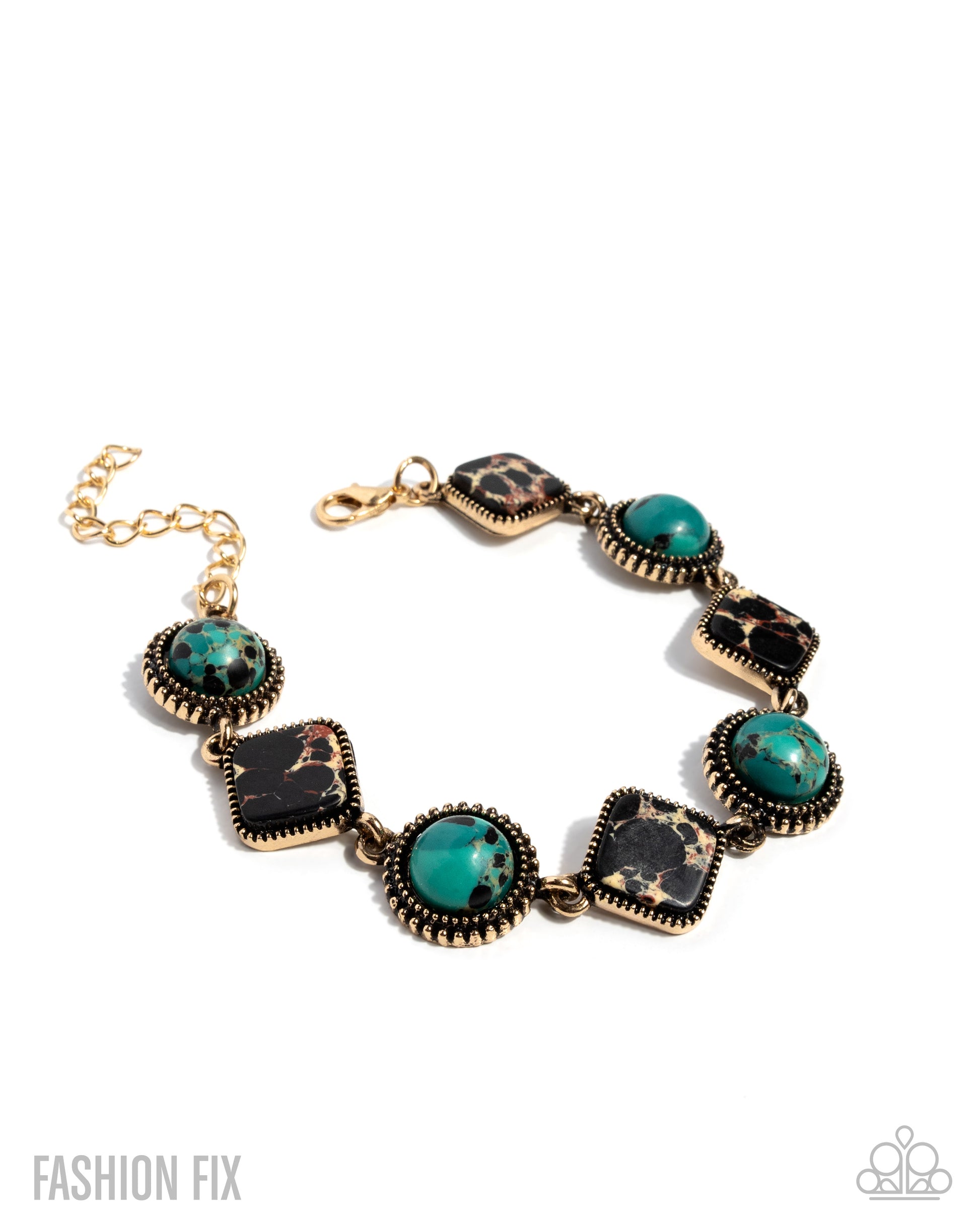 Featuring a marbled effect, a collection of round green stones are pressed in antiqued gold-studded frames, alternating with black-marbled stones in square studded fittings for a touch of daring color. Features an adjustable clasp closure. As the stone elements in this piece are natural, some color variation is normal.
