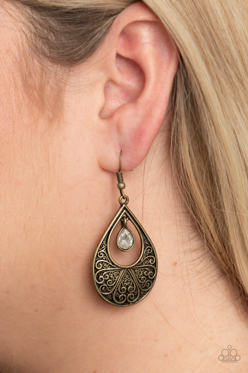 A glassy white rhinestone swings from the top of an airy brass teardrop frame embossed with heart-shaped filigree, creating a whimsical lure. Earring attaches to a standard fishhook fitting.