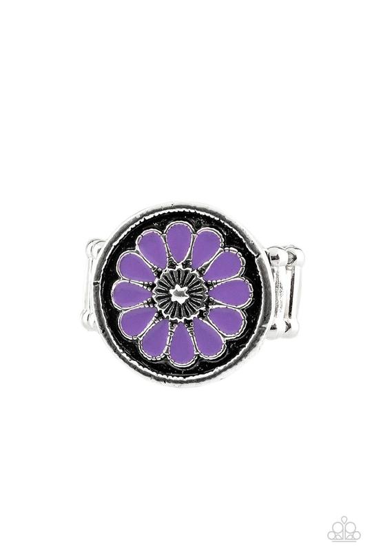 Brushed in an antiqued shimmer, vivacious purple petals spin into a whimsical floral pattern atop the finger. Features a stretchy band for a flexible fit.