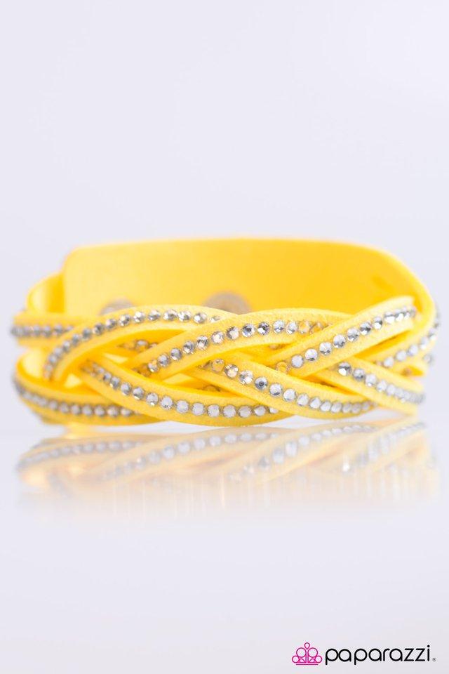 Glassy white rhinestones are sprinkled across interweaving yellow suede bands, creating a timeless sparkling palette across the wrist. Features an adjustable snap closure. Sold as one individual bracelet.