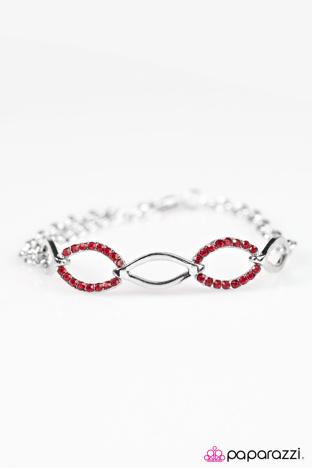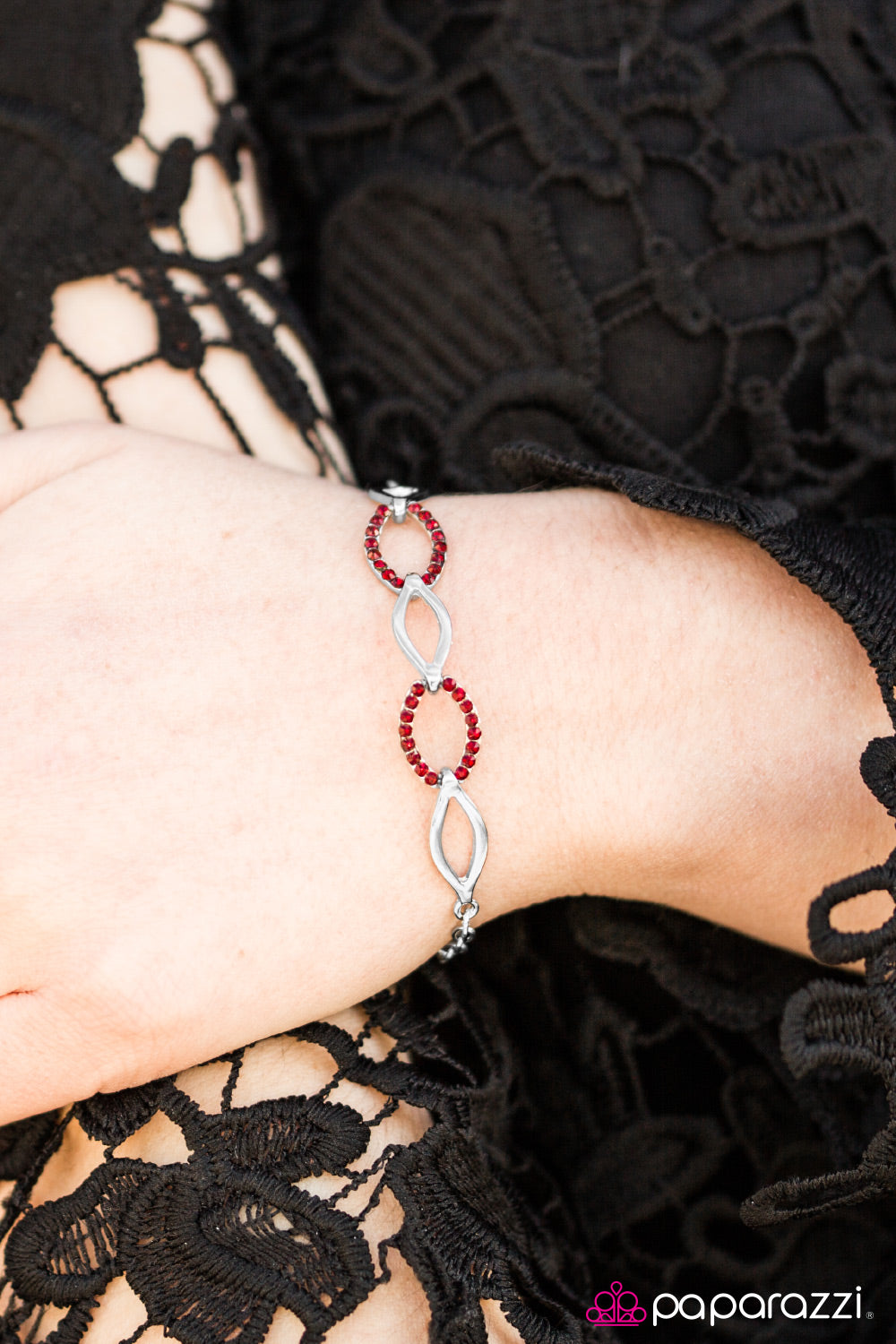Glittery red rhinestones are sprinkled along alternating silver marquise-shaped frames, creating a timeless chain across the wrist. Features an adjustable clasp closure.