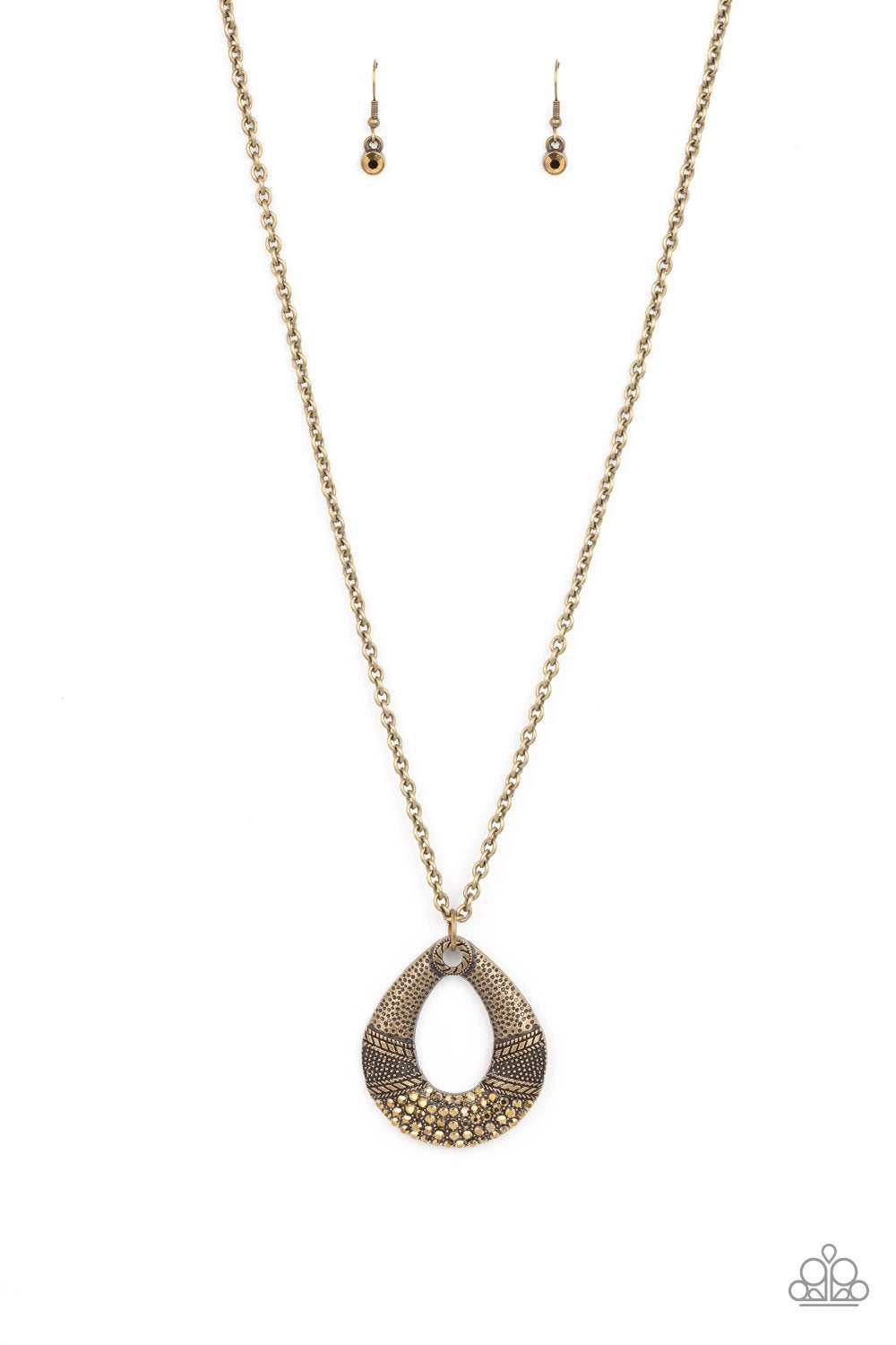 Studded and embossed in bands of texture, the bottom of a hammered brass teardrop is encrusted in golden topaz rhinestones, creating a glitzy pendant at the bottom of a lengthened brass chain. Features an adjustable clasp closure.