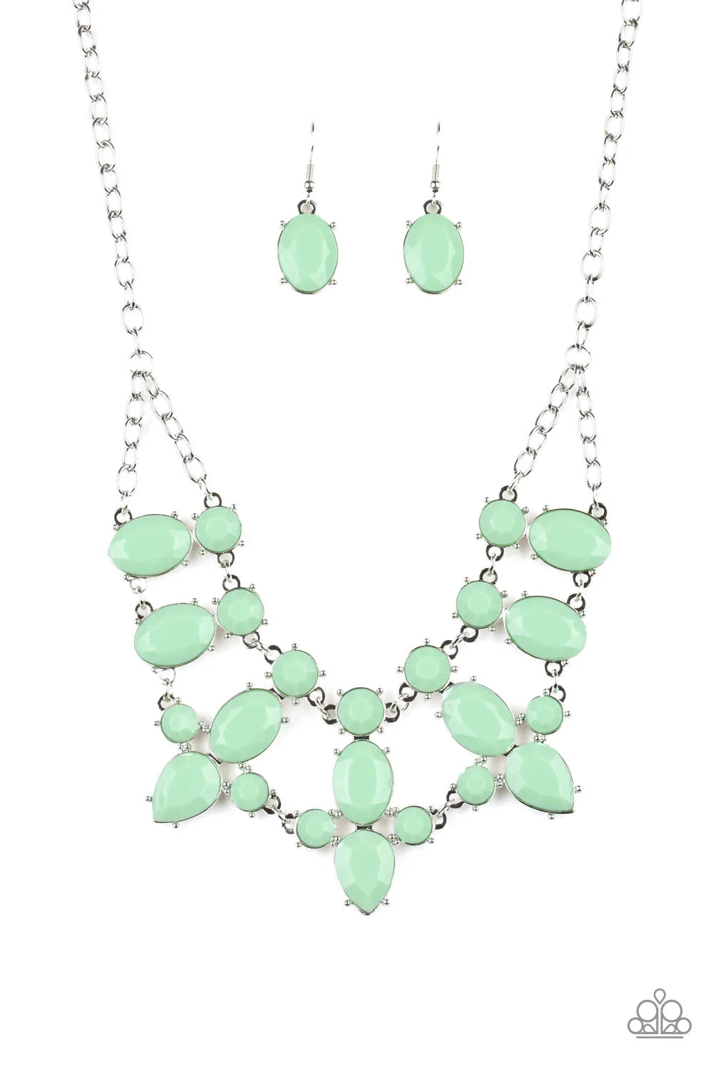 A collision of round, oval, and teardrop Spearmint beaded frames delicately connect below the collar for a glamorous look. Features an adjustable clasp closure.