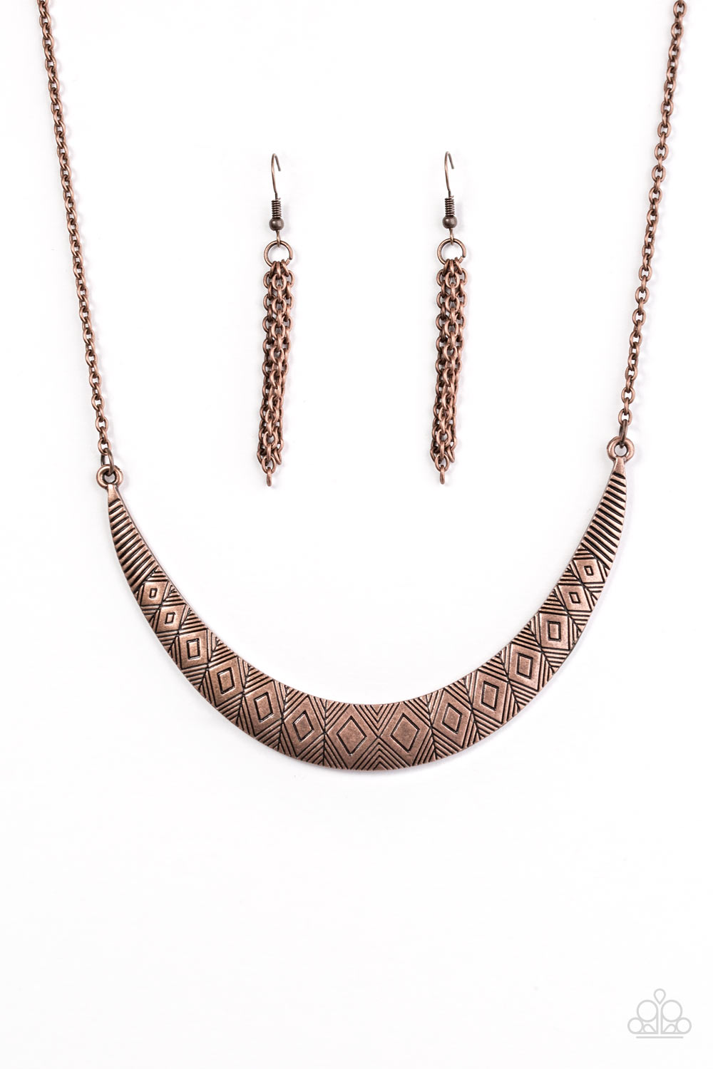 Stamped in tribal inspired patterns, a copper crescent-shaped plate swings from the bottom of a shimmery copper chain, creating a bold pendant below the collar. Features an adjustable clasp closure.