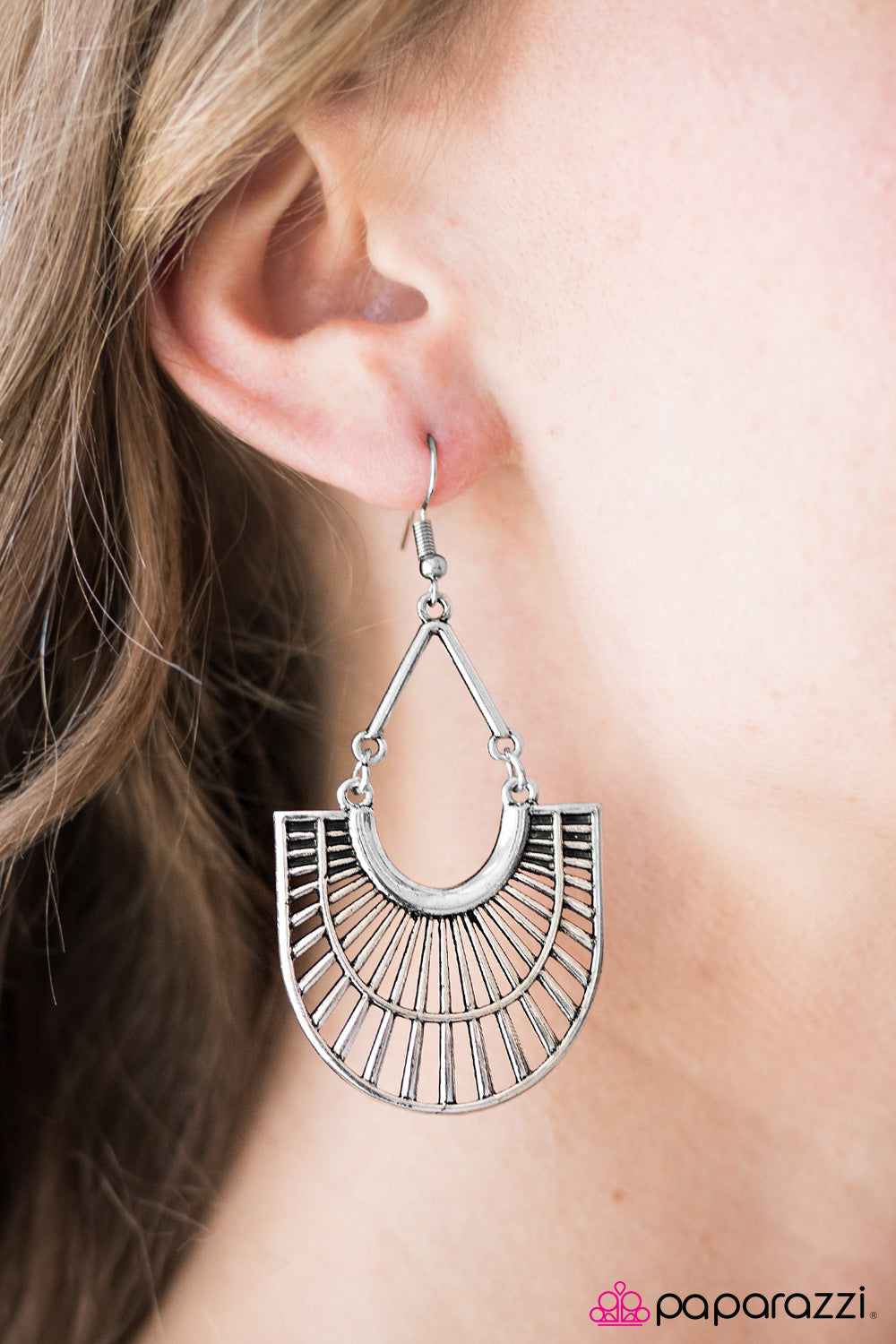 Glistening silver bars radiate from a bowing center, creating an airy lure. The tribal inspired frame swings from the bottom of a V-shaped frame, adding whimsical movement to the shiny piece. Earring attaches to a standard fishhook fitting.