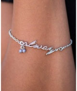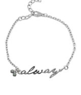 Shiny silver dances into a whimsical charm spelling “always” delicately across the wrist. Dainty white beads dangle from the side of the charm as a subtle accent. Features an adjustable clasp closure.