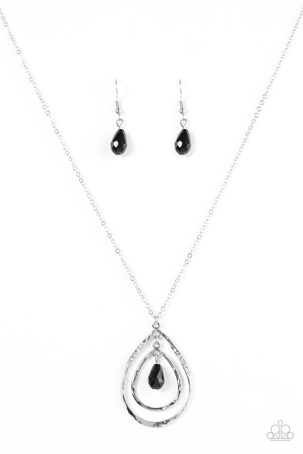 Delicately hammered, two glistening silver teardrops swing from the bottom of a shimmery silver chain. A faceted black bead dangles in the center of the teardrop pendants as the largest frame is encrusted in dazzling white rhinestones for a radiant finish. Features an adjustable clasp closure.