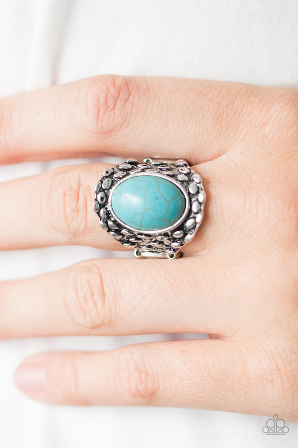 An earthy turquoise stone is pressed into a shimmery silver band embossed in oval texture. Brushed in an antiqued shimmer, the rippling silver band subtlety curves around the stone for a handcrafted, artisanal look. Features a stretchy band for a flexible fit.
