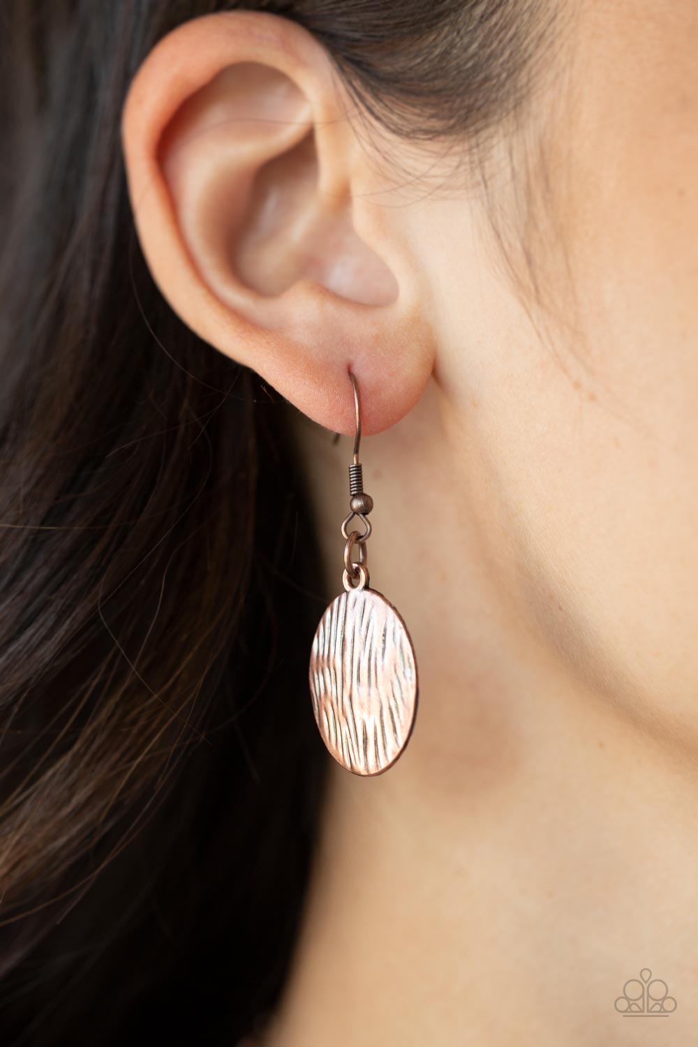 Etched in rustic copper textures, a pair oversized chevron-like copper frames delicately link into a wild statement piece. Matching textured copper discs swing from the bottom of the stacked display, adding noisemaking movement to the rambunctious pendant. Features an adjustable clasp closure.