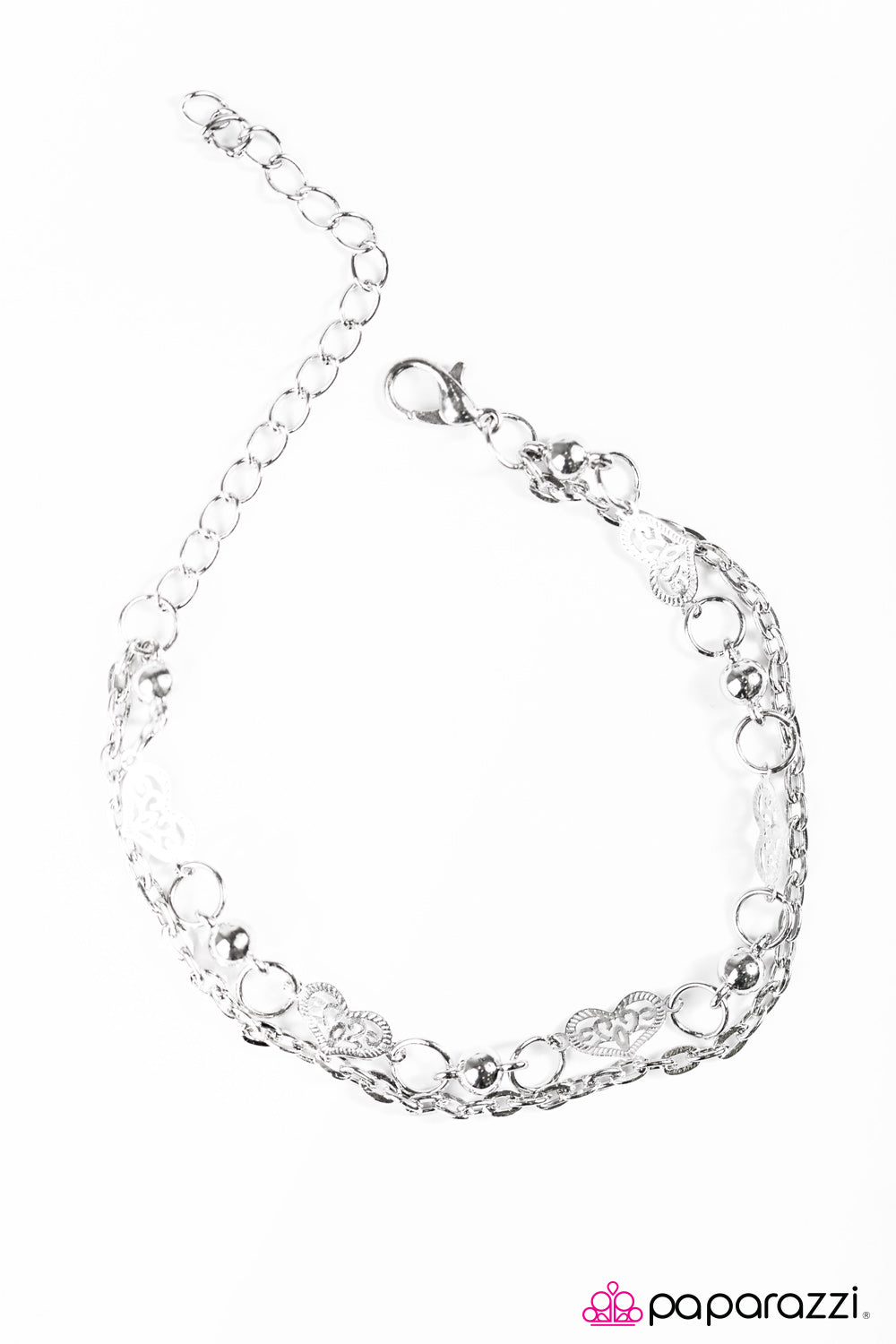 Infused with a shimmery silver chain, glistening silver beading and whimsical heart charms link across the wrist in a timeless fashion. Features an adjustable clasp closure.