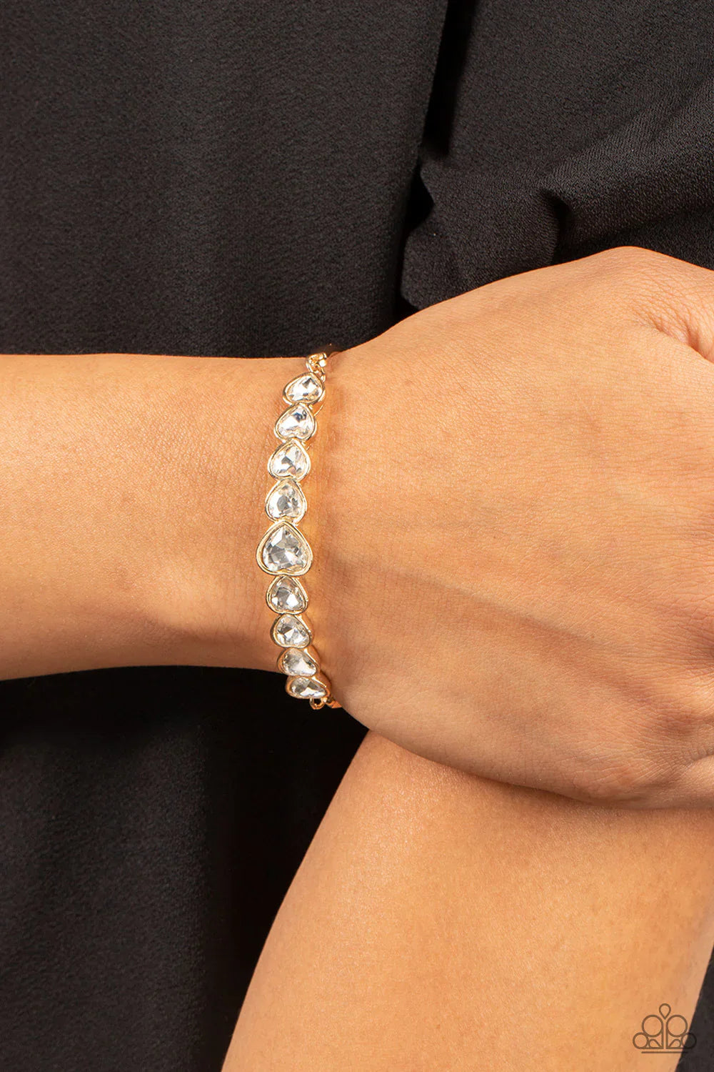 Attached to gold bars, a sparkling series of heart cut white gems are encased in glistening gold frames that curve into a flirtatious centerpiece atop the wrist. Features an adjustable clasp closure.