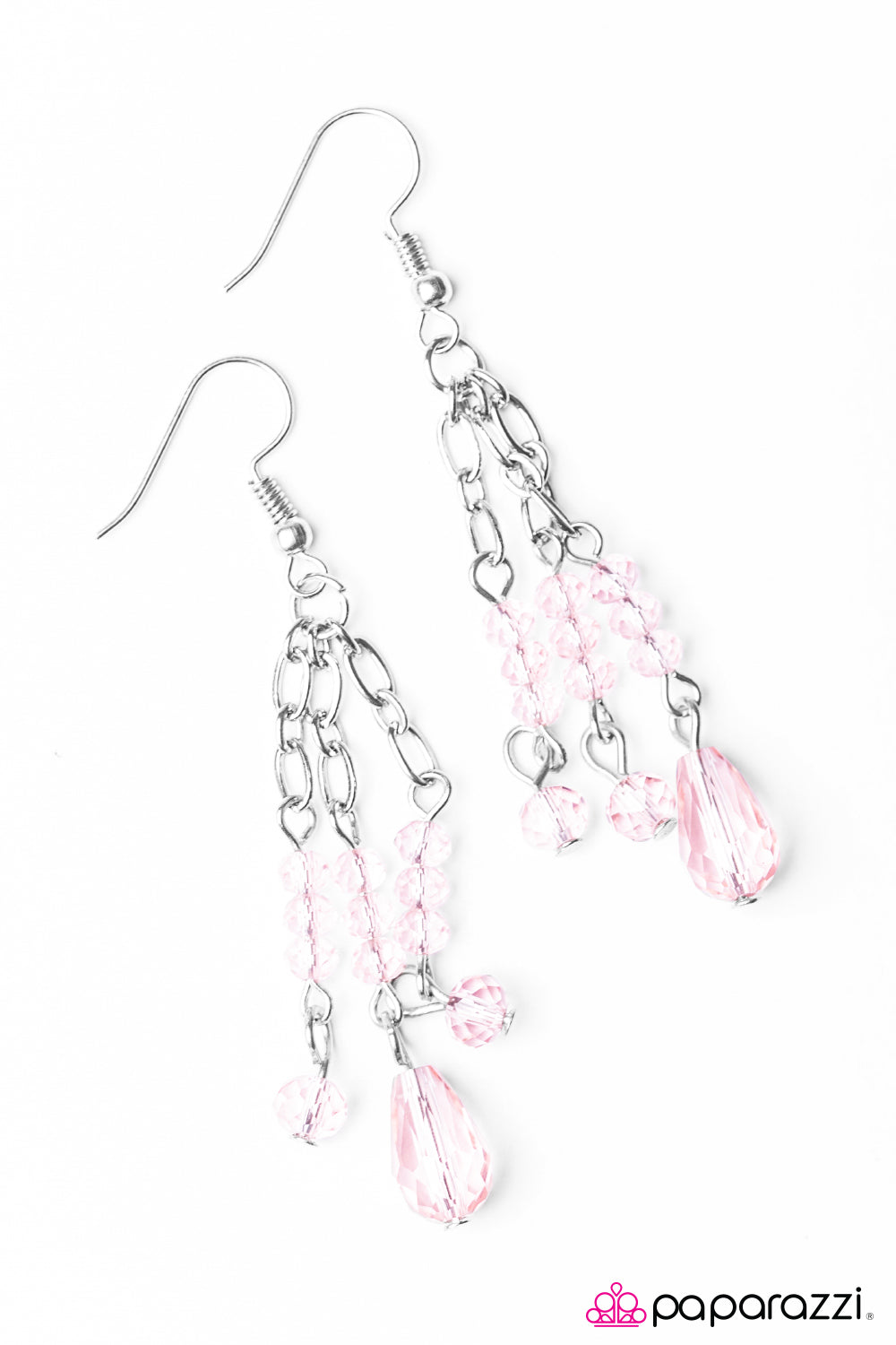 Twinkling pink crystal beads trickle along streams of silver chain, creating a refined lure. Earring attaches to a standard fishhook fitting.