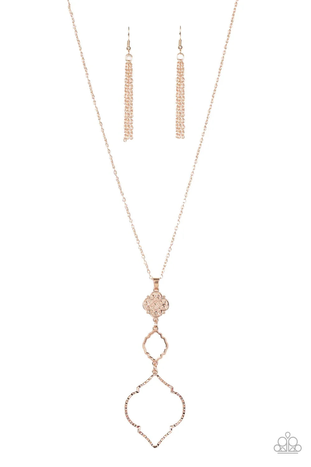 Featuring mandala-like patterns, a floral lattice frame gives way to mismatched scalloped rose gold frames, creating a magnificently stacked pendant at the bottom of an extended rose gold chain. Features an adjustable clasp closure.