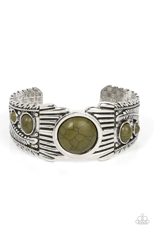 Embossed in leafy silver feathers, a textured silver cuff is adorned in earthy Olive Branch stones, creating a seasonal pop of color around the wrist.