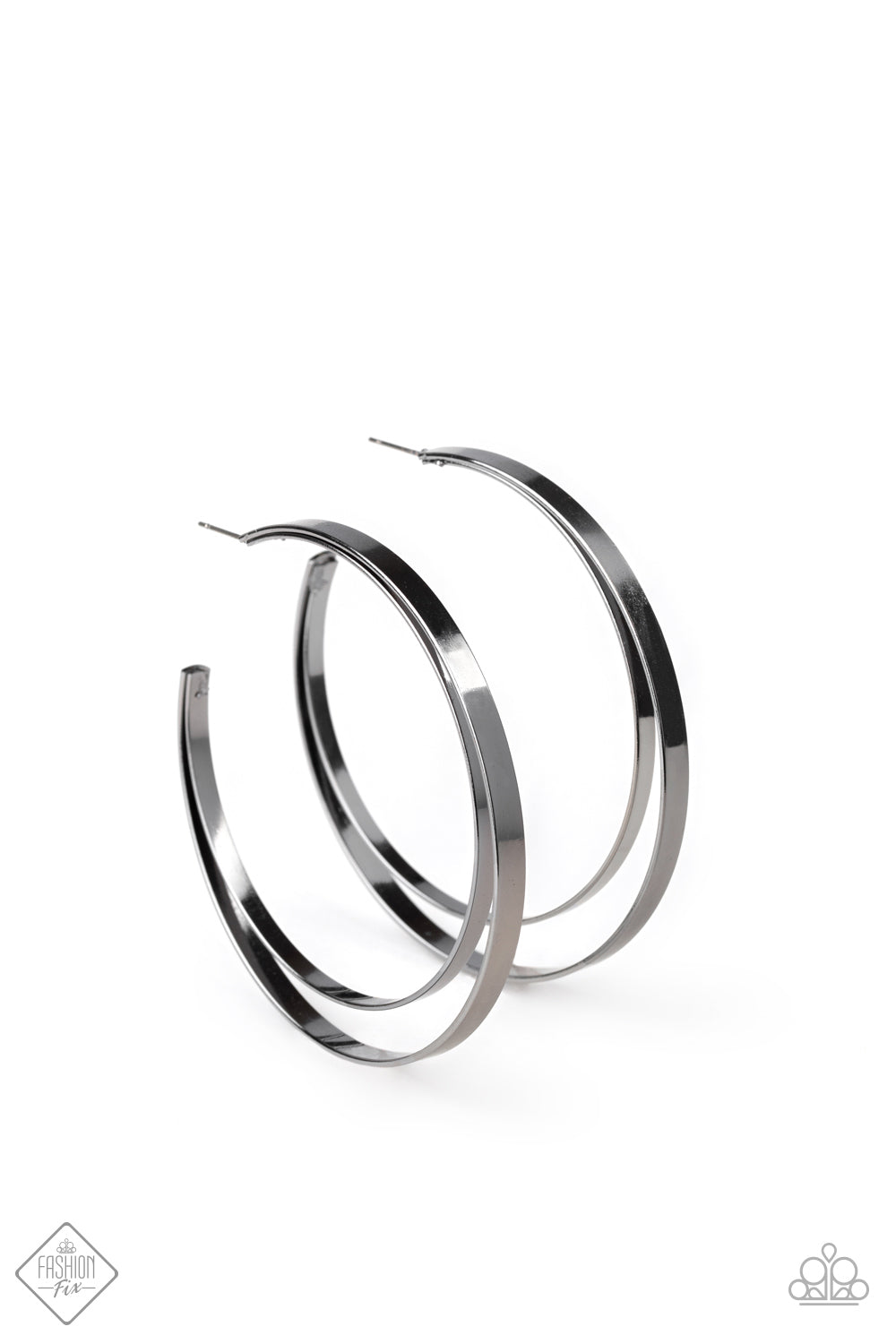 Two flat gunmetal bars curl into a dizzying hoop for a dramatically edgy look. Earring attaches to a standard post fitting. Hoop measures 2 3/4" in diameter.