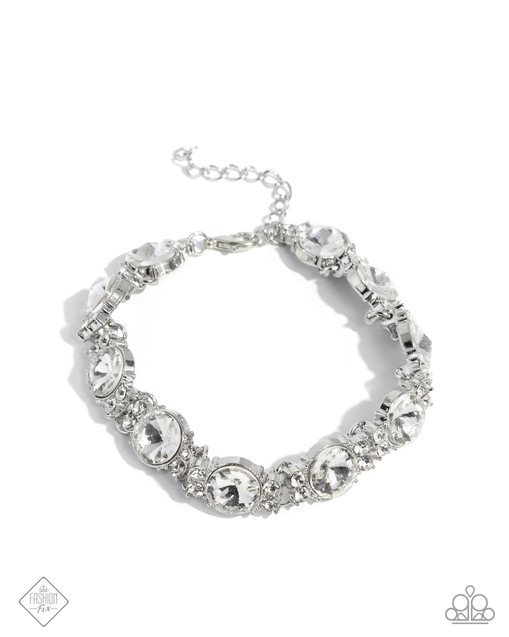 Pressed in silver-pronged fittings, a collection of oversized, faceted white gems come to a point along the wrist, alternating with dainty white rhinestones that stack atop one another for a quartet of additional glitz and glam. Features an adjustable clasp closure.
