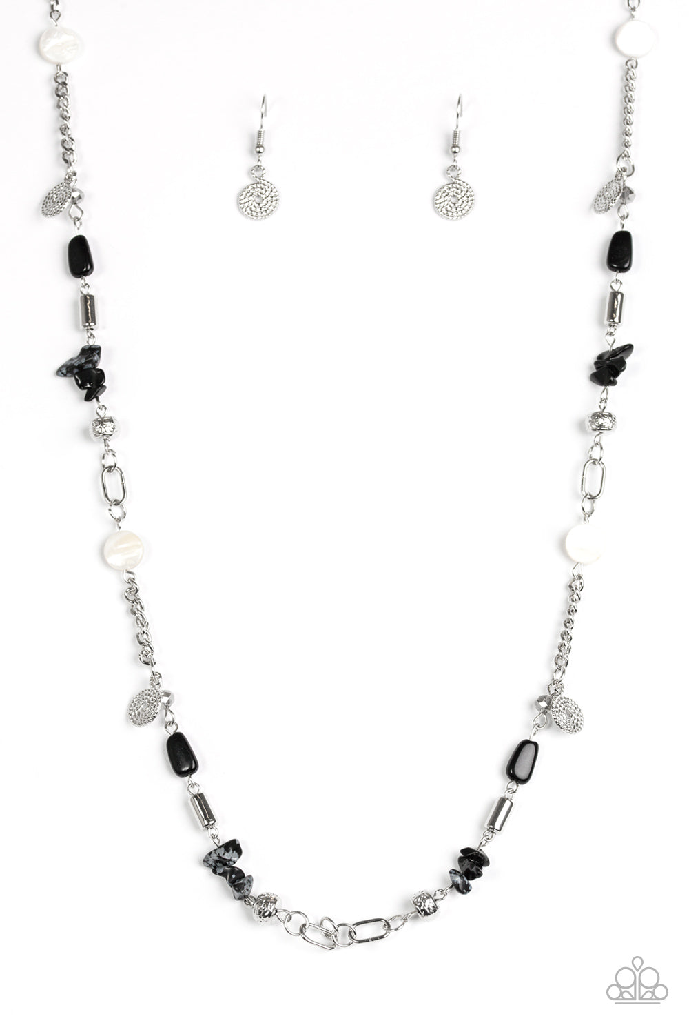 Brushed in shell-like iridescence, bits of black and white stone beading trickles along a shimmery silver chain. Mismatched silver accents are sprinkled between the earthy accents for a seasonal finish. Features an adjustable clasp closure.